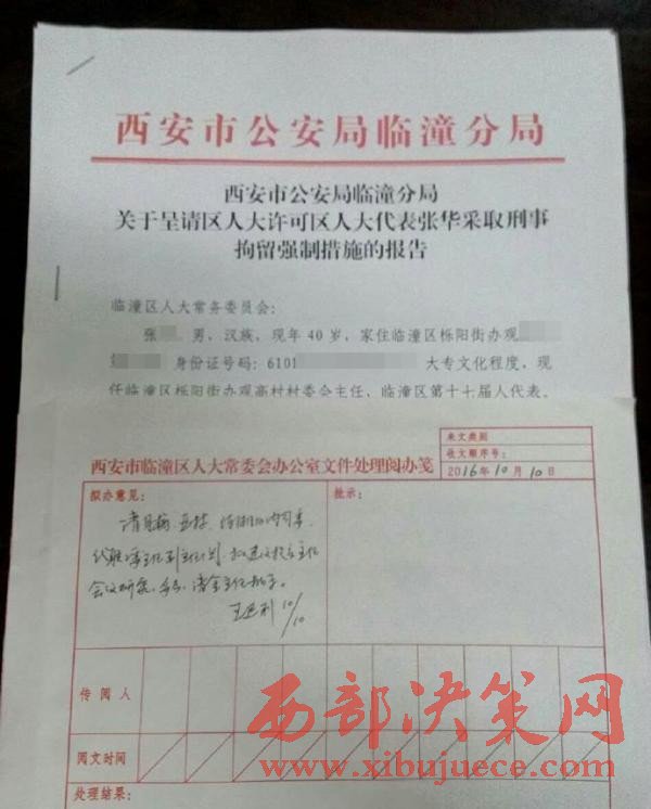 相關人士向澎湃新聞提供的一份西安市公安局臨潼分局關于“呈請區(qū)人大許可區(qū)人大代表張華采取刑事拘留強制措施”的報告顯示,張華,男,家住臨潼區(qū)櫟陽街辦觀高村第六組,現(xiàn)任臨潼區(qū)櫟陽街辦觀高村村委會主任,臨潼區(qū)第十七屆人大代表。上面還附有西安臨潼區(qū)人大常委會辦公室文件處理閱辦箋的擬辦意見:“需研究決定”。