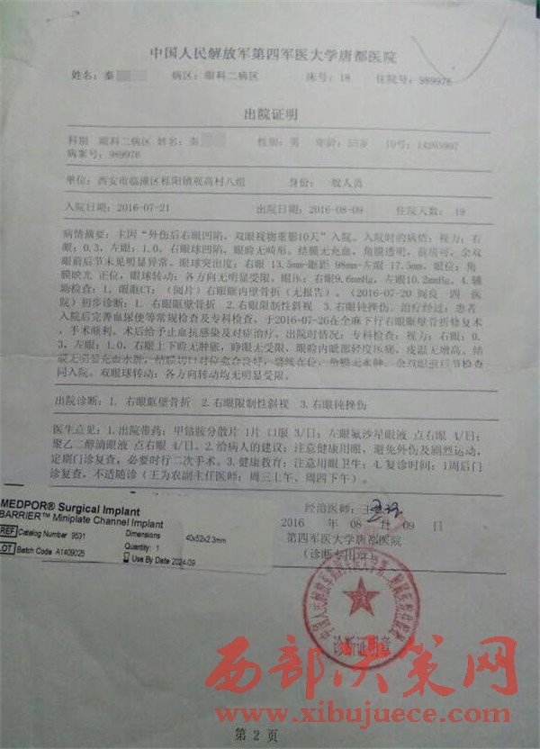 秦見康的出院證明和陜西藍圖司法鑒定中心的鑒定結果。秦見康供圖秦見康向澎湃新聞提供的中國人民解放軍第四軍醫(yī)大學唐都醫(yī)院的出院證明顯示,秦見康7月21日住院,8月9日出院,醫(yī)院診斷結果顯示其右眼眶壁骨折,右眼限制性斜視,右眼鈍挫傷。陜西藍圖司法鑒定中心的鑒定結果顯示,秦見康構成輕傷一級。