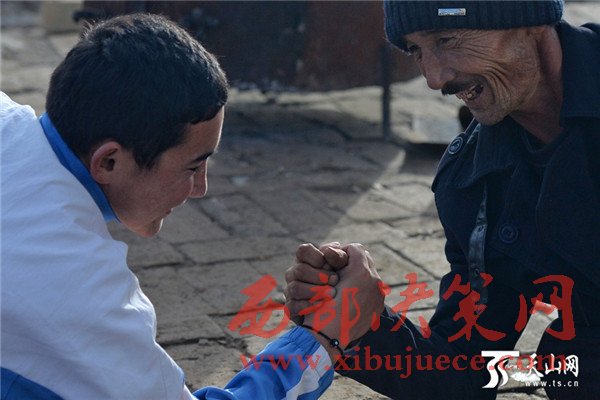 吐爾汗巴衣用手走路四十年,使得胳膊粗壯有力,工人們調(diào)侃父子倆,扳手腕誰(shuí)能贏?