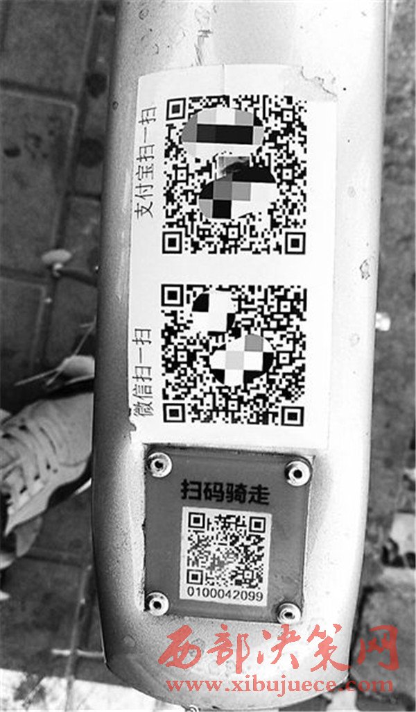 紀先生告訴北青報記者,11月14日下午5點多,自己經(jīng)過海淀區(qū)的海淀大劇院對面,看到路邊停放著摩拜單車,打算解鎖一輛騎著走。“走近一看,發(fā)現(xiàn)在單車的‘掃碼騎走’上方,還貼著一個微信二維碼和一個支付寶二維碼”。