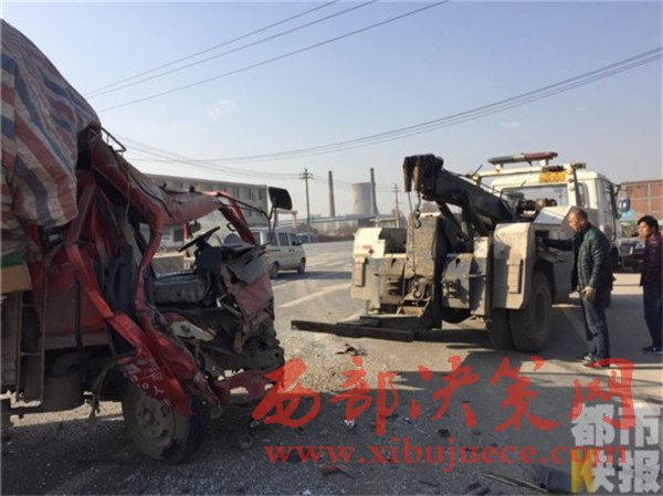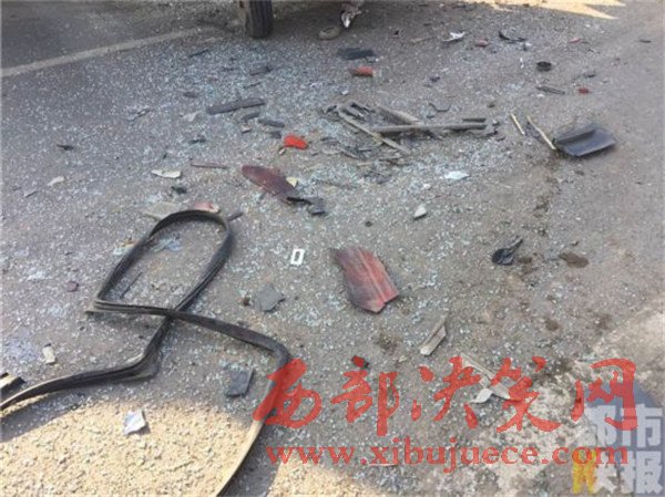 記者在事發(fā)地108國道西安市戶縣境內(nèi)看到,被撞的小貨車已經(jīng)面部全非,前部完全破損。而在這邊一輛拉沙車已經(jīng)沖到了路基下,發(fā)生傾斜。