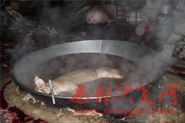 執(zhí)法人員稱,這口大鍋是用來(lái)給生豬褪毛的,隨后就在這露天的骯臟環(huán)境下進(jìn)行屠宰和分割、裝填貨車,這種情況屠宰出來(lái)的豬肉其質(zhì)量可想而知。