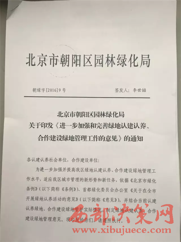 由此看來,朝陽區(qū)園林綠化局對于兒童公園項目的建設(shè)情況有所了解,但是建設(shè)過程中并沒有進行實質(zhì)性管理和監(jiān)督。這也暴露出綠地認建認養(yǎng)規(guī)則的種種問題。朝陽區(qū)園林綠化局局長李世喆采訪中向記者透露,今年1月區(qū)園林局已就綠地認養(yǎng)印發(fā)了《進一步加強和完善綠地認建認養(yǎng)合作建設(shè)綠地管理工作的意見》。