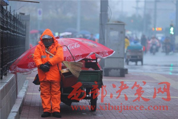 環(huán)衛(wèi)工抱著掃把簸箕在雨雪中睡著