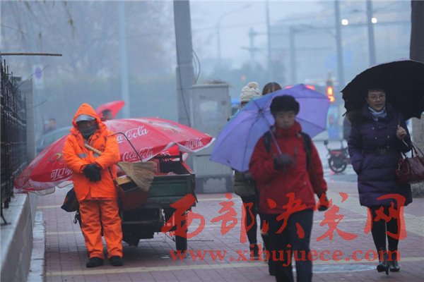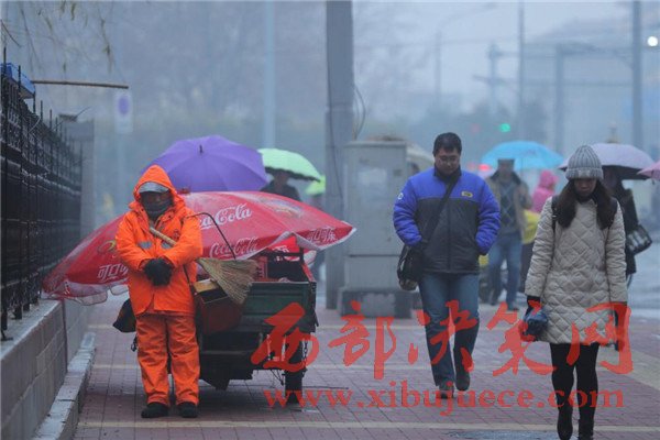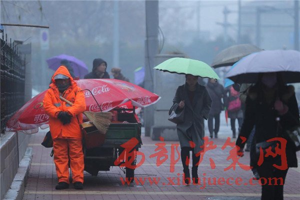 2016年12月26日一早,山東濟(jì)南,天空中飄著細(xì)細(xì)的雪花,一位環(huán)衛(wèi)工人靠在路邊站著睡著了,記者看到,這名環(huán)衛(wèi)工人還懷抱掃把和簸。