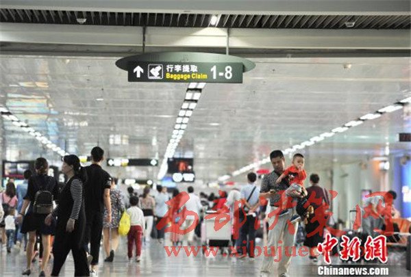 資料圖。圖為??诿捞m機場到達大廳迎來大量進港旅客。