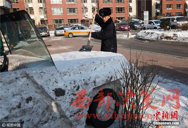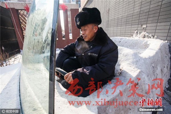 1月3日,吉林省長(zhǎng)春市,六旬保安組團(tuán)建雪雕汽車,上車下車用啤酒箱當(dāng)踏板。