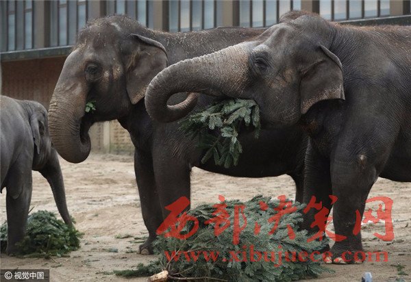 當(dāng)?shù)貢r(shí)間2017年1月3日,德國柏林,Zoologischer Garten動(dòng)物園的大象們食用“圣誕樹”美食大餐。
