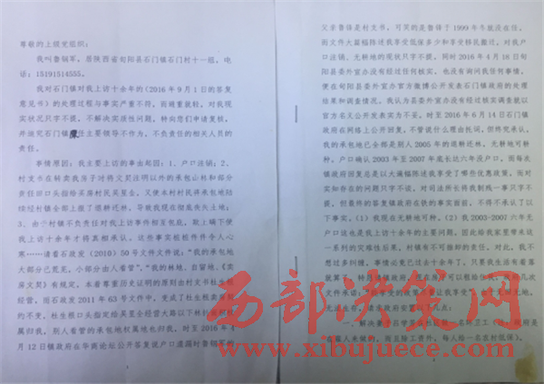2016年12月14日,魯鋼軍來到旬陽縣紀委,向現(xiàn)任旬陽縣紀委書記付波反映該事件,付書記給予書面登記,并口頭承諾盡快解決。