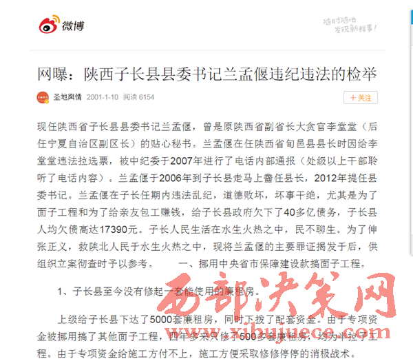 據(jù)微博網友爆料:現(xiàn)任陜西省子長縣縣委書記蘭孟偃,曾是原陜西省副省長大貪官李堂堂(后任寧夏自治區(qū)副區(qū)長)的貼心秘書。蘭孟偃在任陜西省旬邑縣縣長時因給李堂堂違法拉選票,被中紀委于2007年進行了電話內部通報(處級以上干部聆聽了電話內容)。蘭孟偃于2006年到子長縣走馬上齤任縣長,2012年提任縣委書記。蘭孟偃在子長任期內違法亂紀,道德敗壞,壞事干絕,尤其是為了面子工程和為了給親友包工賺錢,給子長縣政府欠下了40多億債務,子長縣人均欠債高達17390元。子長人民生活在水生火熱之中,民不聊生。為了伸張正義,救陜北人民于水生火熱之中,現(xiàn)將蘭孟偃的主要罪證揭發(fā)于后,供組織立案徹查時予以參考?! ∫?、挪用中央省市保障建設款搞面子工程。