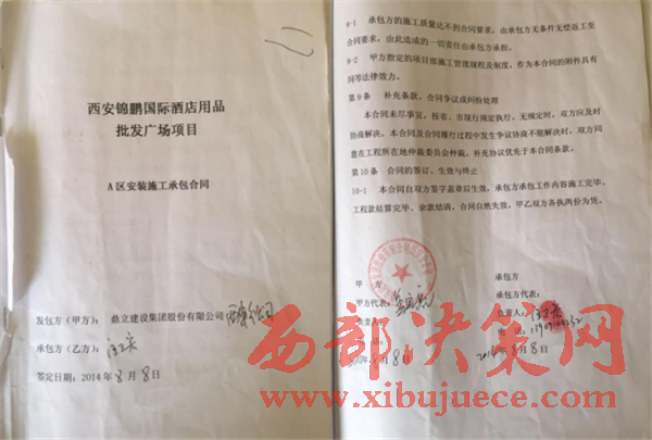 西部決策網(wǎng)訊(王博 通訊員 王德)近期,我社不斷接到汪衛(wèi)宏來(lái)電、來(lái)信稱;2014年4月底,鼎立建設(shè)集團(tuán)股份有限公司西安分公司找到我;讓我?guī)Чと嗽?lsquo;西安錦鵬國(guó)際酒店用品批發(fā)廣場(chǎng)項(xiàng)目’干水、電安裝,至今拖欠民工一百多萬(wàn)工資款;發(fā)包方和業(yè)主雙方相互推諉。