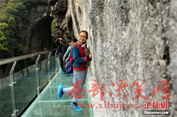 3月24日,地處廣西融安縣石門仙湖景區(qū)的玻璃棧道試運行,數(shù)十名游客體驗“嘗鮮”。該玻璃棧道建在距離谷底達(dá)60米的懸崖壁上,下方是石門仙湖山石峻峭的中天坑,全長309.4米、寬1.6米,是目前廣西最長的玻璃棧道。