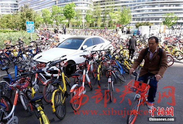 4月18日,北京,一輛私家車被各家公司、不同顏色的“共享單車”包圍。近來,“共享單車”在方便市民出行的同時,缺乏停車管理等問題也逐漸顯現(xiàn)。