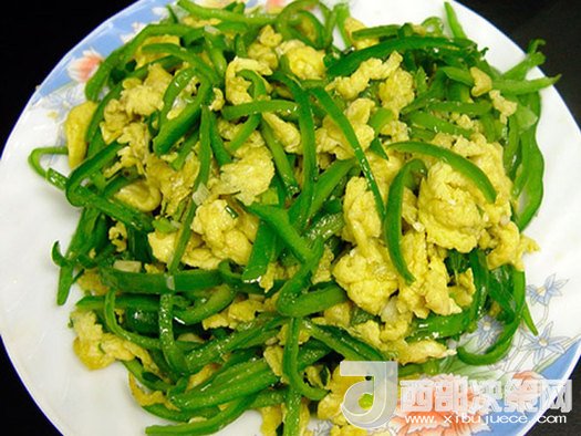 3、往鍋內(nèi)倒入余油,燒熱,放入蔥花熗鍋,隨著放入青椒絲,加精鹽炒幾下,見青椒絲翠綠色時,放入炒好的雞蛋、味精,翻炒均勻,用香醋烹一下,即可出鍋。