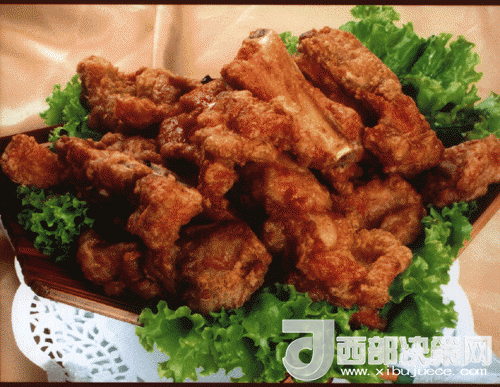 3、油燒到二成熱,把排骨放入鍋中,油溫由低至高慢慢炸制,至肋排成熟、外皮結殼取出瀝干油。