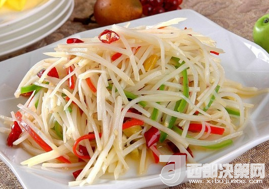 1. 將土豆削皮,切細絲,泡在水中洗去淀粉,既能避免其變黑,又能使其在炒燒時保持白嫩、爽脆。炒前撈出,瀝干水分。