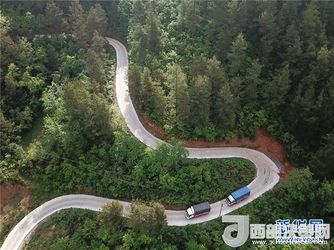 4月22日,幫助吉雪家搬家的貨車(chē)行駛在鄉(xiāng)村公路上(無(wú)人機(jī)拍攝)。