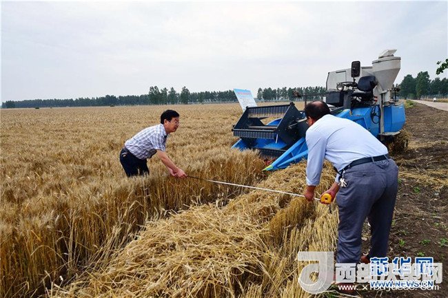 當(dāng)日,在河南省鄧州市腰店鎮(zhèn)國家雜交小麥項(xiàng)目制種基地,專家組對小麥進(jìn)行田間隨機(jī)多點(diǎn)取樣調(diào)查,收割機(jī)對小麥進(jìn)行實(shí)打?qū)嵤铡y產(chǎn)數(shù)據(jù)表明,雜交小麥種子生產(chǎn)在豐產(chǎn)性、抗逆性、抗病性、適應(yīng)性等方面表現(xiàn)優(yōu)異,標(biāo)志著我國雜交小麥研發(fā)進(jìn)入大田應(yīng)用和產(chǎn)業(yè)化階段。新華社記者 馮大鵬 攝