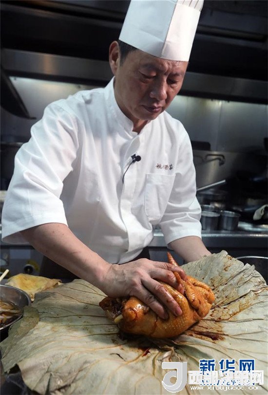 杭州酒家老板吳瑞康現場制作本店招牌菜“叫化雞”(6月16日攝)。新華社記者 李鵬 攝