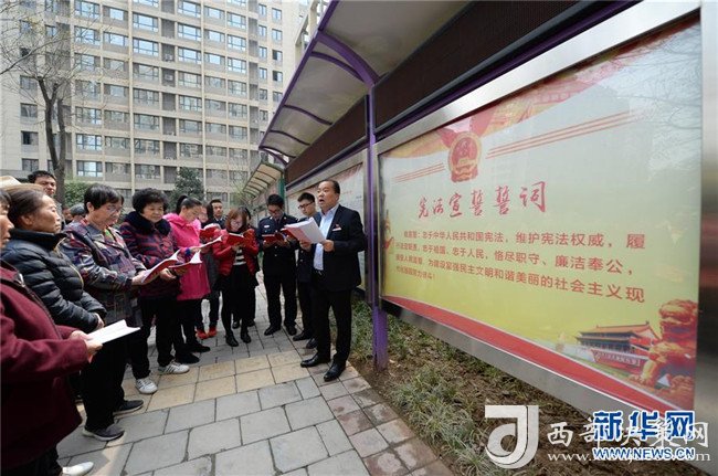 2018年3月20日,陜西寶倫律師事務(wù)所專職律師白銀濤(右一)在西安華遠(yuǎn)君城社區(qū)宣傳憲法知識(shí)。新華社記者 李一博 攝