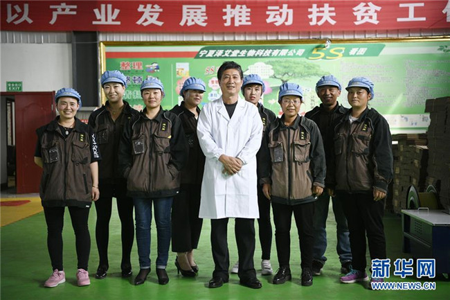 林玉清(左五)與當(dāng)?shù)貑T工合影(8月30日攝)。來自福建莆田的林玉清2017年3月在西吉縣成立寧夏澤艾堂生物科技有限公司,依托西吉縣優(yōu)質(zhì)的艾草種植條件,采用“公司+合作社+農(nóng)戶”的訂單農(nóng)業(yè)合作模式,與吉強(qiáng)、新營等鄉(xiāng)鎮(zhèn)種植專業(yè)合作社合作建成艾草種植基地11個(gè)、推廣種植艾草6000畝,為當(dāng)?shù)厝罕娒撠氈赂讳伨托侣纷?。新華社記者王鵬攝