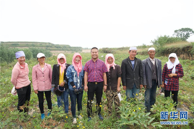 來自福建長樂的林錦云(右五)在寧夏固原市河川鄉(xiāng)與當(dāng)?shù)剞r(nóng)戶合影(8月28日攝)。2014年,林錦云通過土地流轉(zhuǎn)方式,承包了河川鄉(xiāng)1.5萬畝荒山,打造油用牡丹生產(chǎn)基地。目前,林錦云種下的7600畝油用牡丹已經(jīng)開始受益,公司已就近吸納村民300多人就業(yè),其中建檔立卡戶39戶,人均年收入2萬多元。 新華社記者姜克紅攝