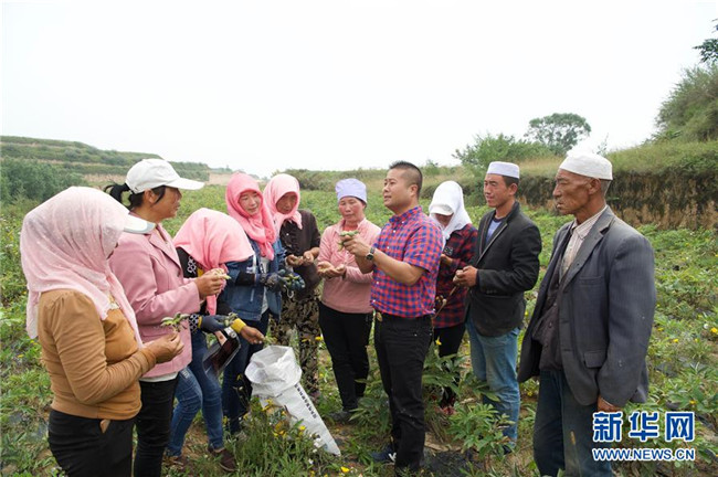 來自福建長樂的林錦云(右四)在固原市河川鄉(xiāng)向農(nóng)戶講解采摘注意事項(xiàng)(8月28日攝)。2014年,林錦云通過土地流轉(zhuǎn)方式,承包了河川鄉(xiāng)1.5萬畝荒山,打造油用牡丹生產(chǎn)基地。目前,林錦云種下的7600畝油用牡丹已經(jīng)開始產(chǎn)生效益,公司已就近吸納村民300多人就業(yè),其中建檔立卡戶39戶,人均年收入2萬多元。 新華社記者姜克紅攝
