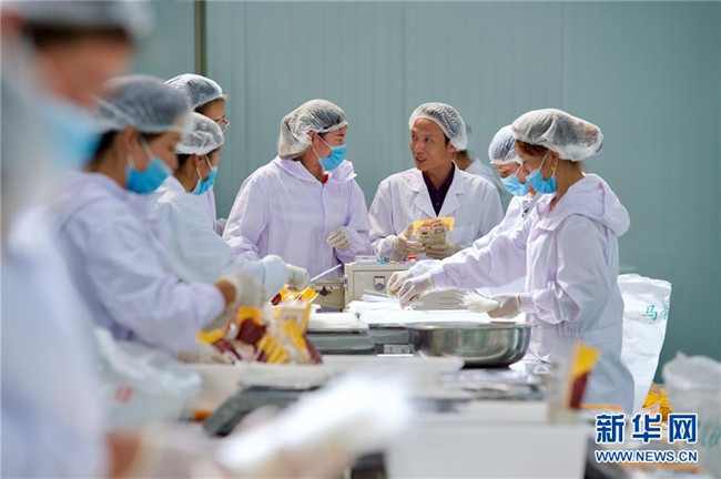 黃玉仁(右三)在寧夏固原市隆德縣寧夏黃土地農(nóng)業(yè)食品有限公司與員工交流馬鈴薯產(chǎn)品包裝注意事項(xiàng)(8月29日攝)。來自福建莆田的黃玉仁2017年在隆德縣創(chuàng)辦寧夏黃土地農(nóng)業(yè)食品有限公司,利用當(dāng)?shù)伛R鈴薯種植優(yōu)勢,制作馬鈴薯深加工產(chǎn)品,促進(jìn)當(dāng)?shù)伛R鈴薯銷售和農(nóng)民增收。目前公司已建成4條生產(chǎn)線,為當(dāng)?shù)?0多名百姓解決就業(yè)。 新華社記者姜克紅攝