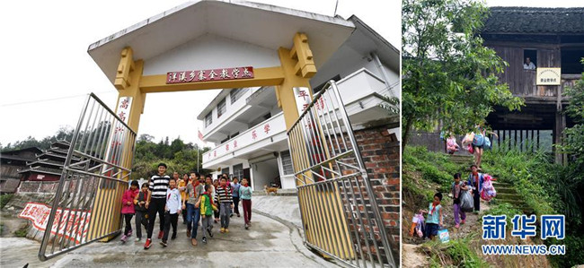 這是一張拼版圖片,左圖為2017年11月17日,廣西三江侗族自治縣洋溪鄉(xiāng)安馬小學(xué)寨全教學(xué)點教師吳周成和學(xué)生們走出學(xué)校;右圖為2014年6月10日,黃開亮在位于吊腳樓里的教學(xué)點目送學(xué)生離校。作為該教學(xué)點的一名老師,黃開亮在這座三面透風(fēng)的吊腳樓里堅守了30年。2014年,師生們搬進了三層高的新教學(xué)樓;而黃開亮的學(xué)生、“95后”小伙吳周成也回到學(xué)校,以支教老師的身份傳承老班主任的奉獻精神。新華社發(fā)(黎寒池 攝)