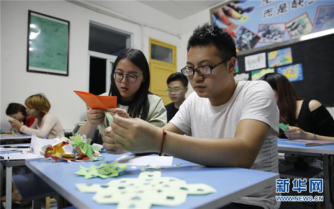 四川省華鎣市慶合初級中學(xué)教師王俊又(右一)與許玉玲在練習(xí)剪紙(4月17日攝)。慶合初級中學(xué)位于華鎣山腳下,由于距離縣城較遠,該校大部分教師長期“以校為家”。
