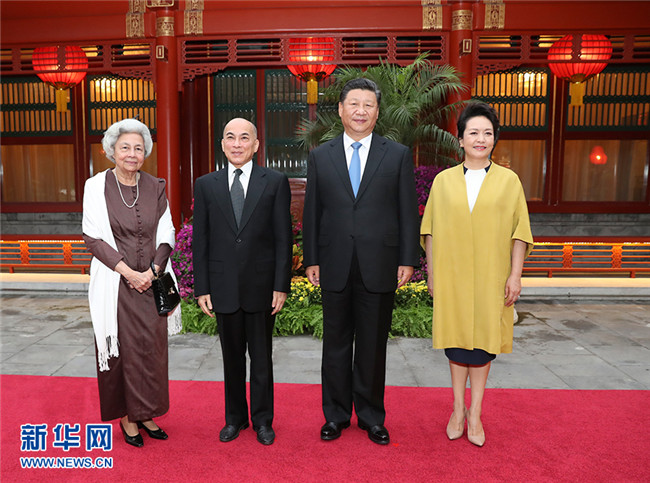 19日晚,在中秋佳節(jié)來臨之際,國家主席習近平和夫人彭麗媛在釣魚臺國賓館親切看望正在北京休養(yǎng)的柬埔寨國王西哈莫尼和太后莫尼列。