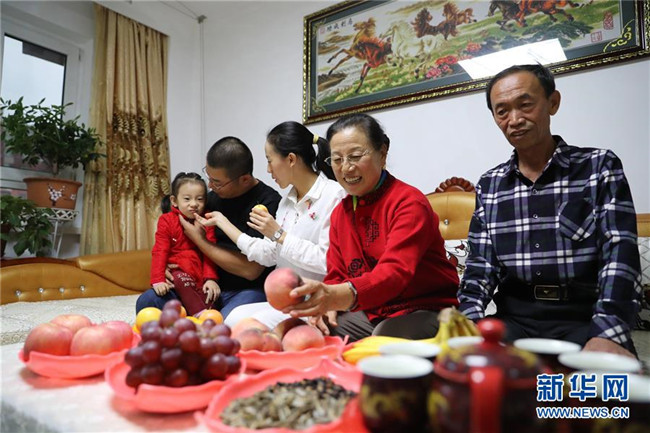 遼寧撫順市東華園社區(qū)居民陳玉芳(右二)一家(9月28日攝)。新華社記者楊青攝