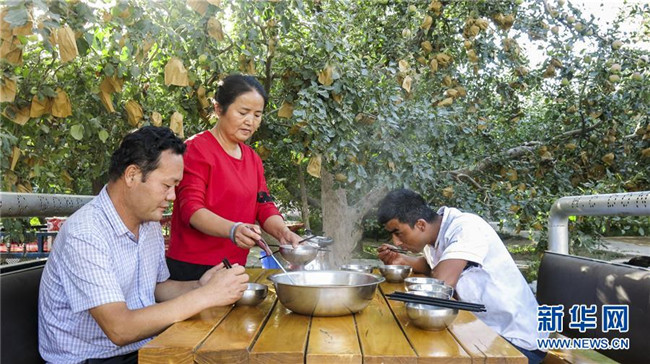 甘永軍(左一)在地處新疆阿克蘇地區(qū)柯柯牙綠化工程內(nèi)的果園吃飯(2017年9月22日攝)。10年前,甘永軍還在果園開(kāi)起了第一個(gè)農(nóng)家樂(lè),帶動(dòng)周邊100多戶(hù)果農(nóng)經(jīng)營(yíng)起了自家庭院。新華社記者 杜剛 攝
