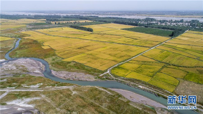 這是在地處阿克蘇河上游的溫宿縣托甫汗鎮(zhèn)阿亞克其村拍攝的一處由生態(tài)防護(hù)林守護(hù)的稻田(9月23日無(wú)人機(jī)拍攝)。新華社記者 胡虎虎 攝