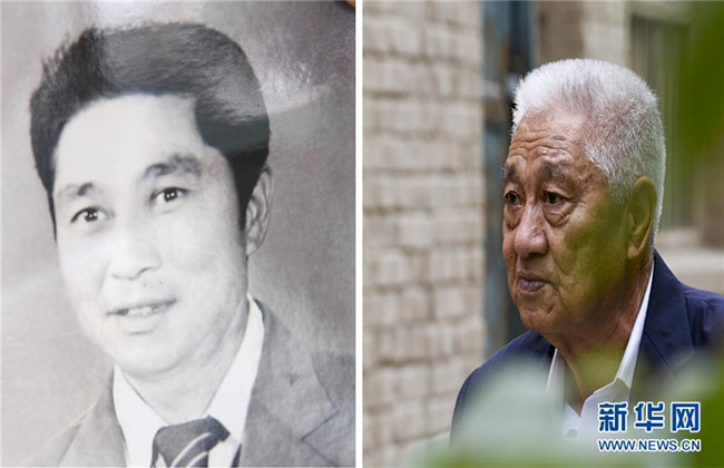 拼版照片:左圖為柯柯牙林管站第一任站長(zhǎng)依馬木·麥麥提調(diào)任林管站長(zhǎng)時(shí)的照片;右圖為已退休的依馬木·麥麥提向記者講述柯柯牙綠化工程(9月22日攝)。新華社記者 胡虎虎 攝