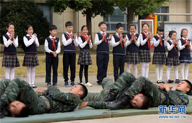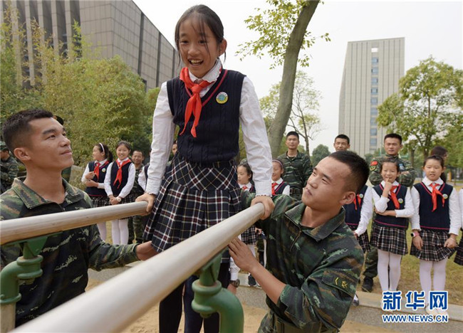 10月9日,少先隊員們在武警安徽總隊合肥支隊體驗官兵訓練。