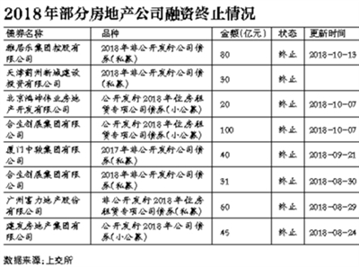 2018年10月份以來(lái),已經(jīng)有多起涉房融資計(jì)劃中止/終止。上交所信息顯示,截至10月25日,已經(jīng)至少有8筆涉房融資計(jì)劃中止或終止審查。諸如,雅居樂(lè)擬發(fā)行的80億元非公開(kāi)發(fā)行公司債券“終止”,該筆公司債曾于今年7月“中止”發(fā)行。合生創(chuàng)展100億規(guī)模的租賃住宅專(zhuān)項(xiàng)公司債券、天津薊州新城建設(shè)投資有限公司30億元的非公開(kāi)發(fā)行公司債券、北京鴻坤偉業(yè)房地產(chǎn)開(kāi)發(fā)有限公司20億元的住房租賃專(zhuān)項(xiàng)公司債券“終止”審查。10月份顯示“中止”融資計(jì)劃的有:中山招商-時(shí)代地產(chǎn)購(gòu)房尾款資產(chǎn)支持專(zhuān)項(xiàng)計(jì)劃,擬發(fā)行金額14.3億元;奧園集團(tuán)有限公司非公開(kāi)發(fā)行2018年住房租賃專(zhuān)項(xiàng)公司債,擬發(fā)行金額10億元,等等。