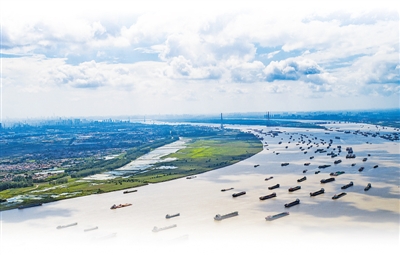 船舶在湖北武漢陽邏港區(qū)水域行駛(2018年8月13日無人機拍攝)。 |