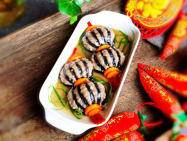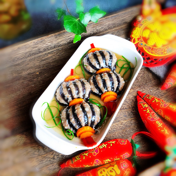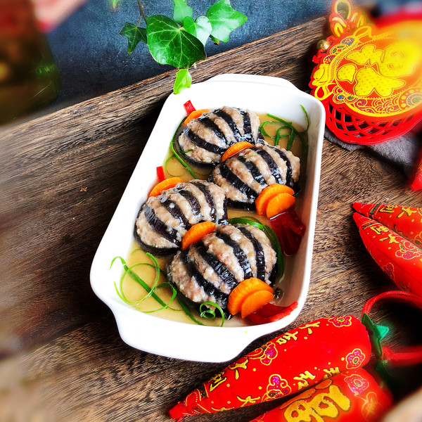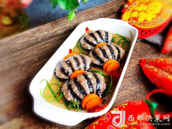 “今天買(mǎi)了一個(gè)大茄子,釀入豬肉餡,樣子像極了燈籠,如果你想顏色更深一點(diǎn),那就在調(diào)肉餡的時(shí)候加點(diǎn)老抽甚至加點(diǎn)紅曲粉,最后調(diào)澆汁的時(shí)候可以調(diào)成酸甜的番茄汁味,那就看起來(lái)更加的紅紅火火了。不過(guò)我還是比較喜歡這種小清新的風(fēng)格。這道菜一上桌,能把大魚(yú)大肉都比下去,好看好吃還喜慶。”