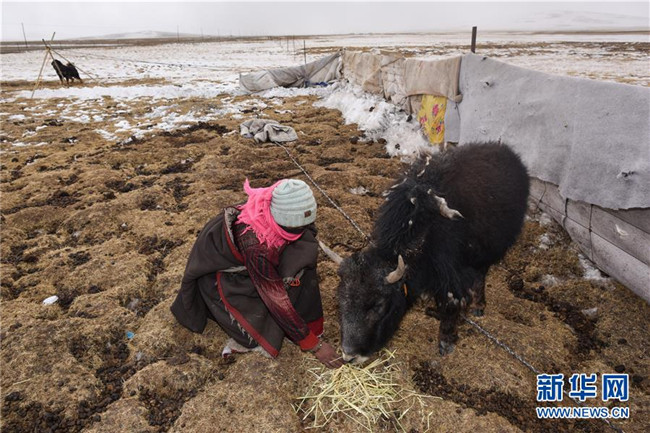 2月22日,才巴拉加在麥雄灘的帳篷前給牛犢喂飼料。新華社記者吳剛攝