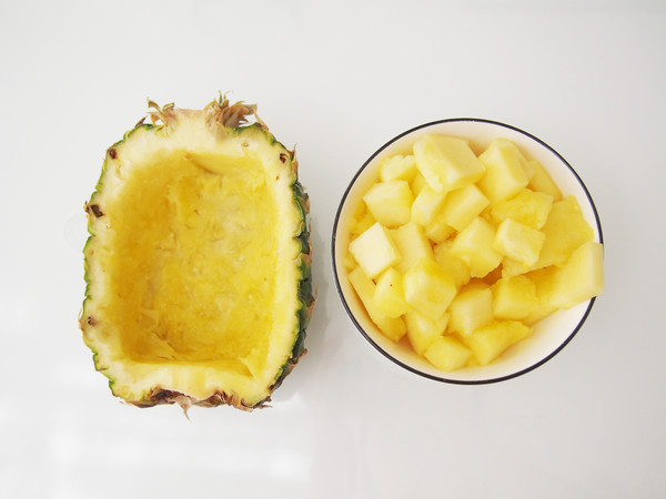 5.等待蒸米飯的時(shí)候,準(zhǔn)備其他食材。將菠蘿果肉挖出來(lái),切成丁
