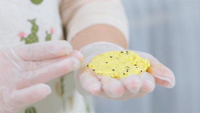 7.取適量小米飯,放在手上,擠壓成餅狀。