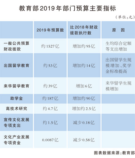 關(guān)于資金來源,教育部2019年部門預(yù)算顯示,2019年一般公共預(yù)算財(cái)政撥款約為1527億元,比上年執(zhí)行數(shù)增加約95億元。其主要原因?yàn)樯C合定額、出國留學(xué)經(jīng)費(fèi)以及學(xué)生資助工作專項(xiàng)等支出增加。