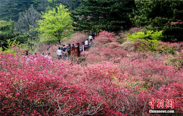 4月20日,游客在龜峰山的杜鵑花海游玩。近日,湖北省麻城市龜峰山的古杜鵑花盛開(kāi),大量游客前來(lái)賞花觀景。中新社記者 汪立敏 攝