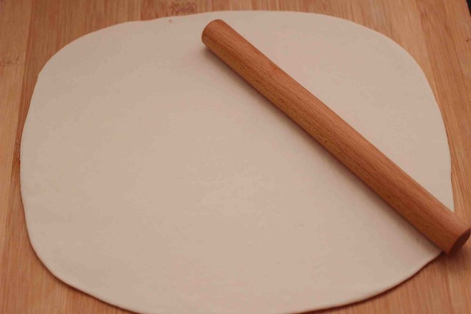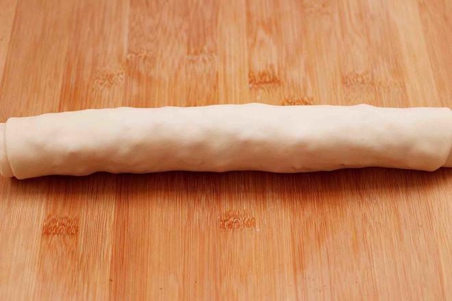 8.搟面杖搟成一塊盡量大的長方形面片。 硅膠刷子蘸上花生油,均勻地涂抹在面皮上。