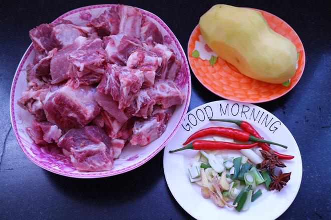1.準備食材:排骨一斤,土豆一個,蔥姜段少量,八角兩粒,紅辣椒2.3個