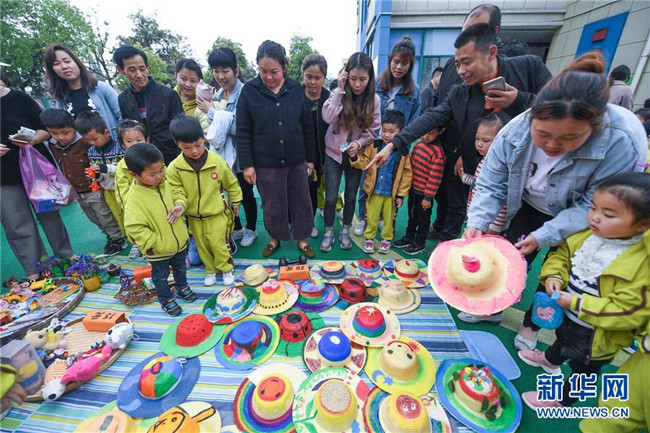 4月28日,家長帶著孩子們在挑選手工作品。 新華社記者 徐昱 攝