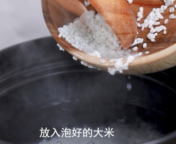 \n放入泡好的大米再放入腌制好的肉沫和香油攪拌開,大火燒開,轉(zhuǎn)小火熬煮30分鐘