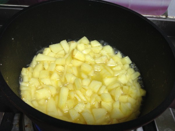 6.倒入少許水淀粉收汁冷卻備用,加入水淀粉可以讓蘋(píng)果丁口感會(huì)更綿滑