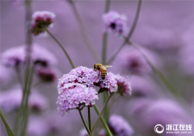 5月12日,在杭州城北體育公園邊,柳葉馬鞭草進入盛花期,開成了一片紫色花海,吸引著許多市民在花海里愜意徜徉。(浙江在線記者 林云龍 攝)